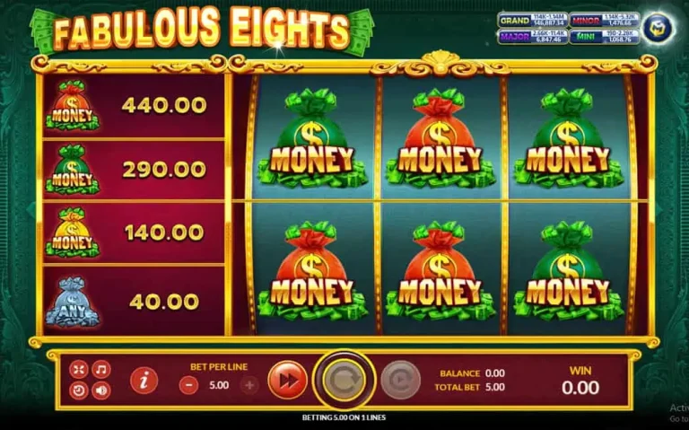 Fabulous Eights เป็นเกมแนวเรียงตองที่มีมีขนาด 2X3 ช่อง ใช้เงินเดิมพันได้ตั้งแต่ 1-200 บาท นำเสนอเกมด้วยสัญลักษณ์ในเกมเป็นถุงใส่เงิน 3 สี ได้แก่ ถุงทอง ถุงเขียว และถุงแดง วิธีหรือชนะเกม Payline จะเป็นการเรียงตองให้สัญลักษณ์เดียวกันวางตรงกับกับเส้นกั้นกลางครบทั้ง 3 ช่อง ถือเป็นเกมส์ ที่เข้าใจง่ายมาก แต่ก็ชนะเกมได้เงินสูงค่อนข้างยากเช่นกัน